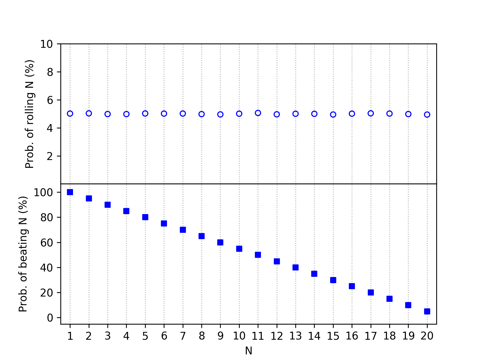 The easiest place to start is with the D20 itself. If we roll it 1,000,000 times, then we should expect each of the 20 possible values to come up about equally often. That is exactly what is shown in the top panel of the figure below. Each blue dot is the probability (y-axis) of rolling each specific number \( N \) on the D20 (x-axis). The bottom panel is also a probability plot, but this time showing the chances of beating (rolling equal or greater to) any given \( N \). Unsurprisingly, beating a lower roll is more likely than beating a higher one.